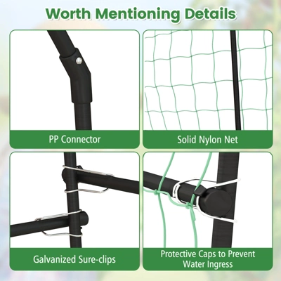 - Hassle-free Assembly: Garden trellis netting kit Includes 1 trellis netting, Garden trellis( 3*arches, 6*angled supports, 2*short cross braces, 6* staked supports, 9* male cross braces, and 9 * female cross braces), 31 sure clips, 1 hole rod. It is easy to put together with no tools required.
