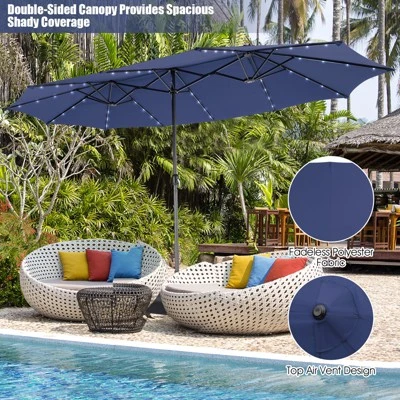 Our twin outdoor umbrella offers comfortable shading place for garden, backyard, patio and market. If you have needs to block up the sunlight, our double-sided umbrella will be your ideal choice. Comes with 15.4′ x 9.2′ large canopy, this patio umbrella will provide roomy shading space for you to enjoy the coolness. Since the durable polyester fabric, the umbrella will effectively block up the sunlight, and the fabric is fade resistant for long-term outdoor use. What’s more, there are 48 solar LED lights on the ribs to offer brightness and enhance romantic feel during night talk. The hand crank mechanism facilitates umbrella opening and closing, and the widen base with weighted sand bag (sands are not included) increases using stability.