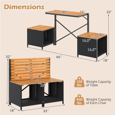- Seamless Convertible Design: Equipped with premium hinges and reliable fixing buckles, this innovative piece converts smoothly from a charming patio table and chairs set to a comfortable 2-seater bench. It’s the perfect choice for flexible outdoor arrangements.