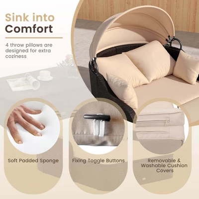- [Adjustable Sunshade]: This patio daybed features a retractable canopy, which allows you to relax in superb coolness in the hot weather when open or enjoy warm sunshine in the cold weather when closed. Moreover, the fixing ties will keep the canopy in place when not in use.