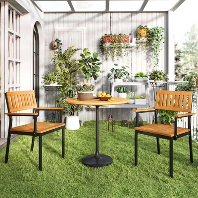 - Maintenance Tips: Due to sun exposure, temperature variations, and changes in air humidity, the wood surface would become drying or fading. Apply the wood polish oil on the soft cloth, and then use it to wipe the wood surface. It could become glossy and new. Designed for comfort, these chairs feature curved backrests, armrests, and a breathable slat design that enhances your sitting experience during meals or gatherings. Our acacia wood and metal dining chairs could effortlessly complement various indoor and outdoor settings, adding elegance and functionality to various spaces.