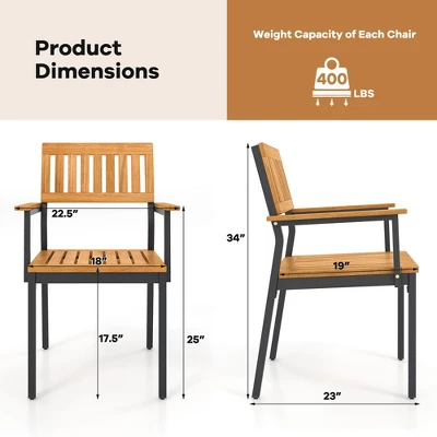 Elevate Your Dining Experience!Our patio dining chair set includes 2 chairs, each chair measures 22.5″ x 23″ x 34″(L x W x H), and the seat height is 17.5″. Constructed of reliable acacia wood and treated with protective oil finish, the wooden seats and backs of these chairs ensure longevity and resistance to daily wear. Besides, equipped with heavy-duty powder-coated metal frames and adjustable footpads, each chair is designed to offer maximum stability and support, ensuring 400 lbs strong loading capacity (each chair).