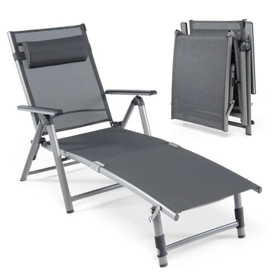 Enjoy your leisure time with this versatile lounge chair!Thanks to the lightweight and rustproof aluminum frame, this patio lounge chair is easy to carry and can be used outdoors for a long time. The folding design makes it convenient to store when not in use. In addition, the breathable fabric offers cozy experience, and it is quick-drying for easy maintenance. Designed with 8-position ergonomic backrest and 2-position footrest, this reclining lounge chair allows you to rest on the patio, poolside, beach, etc. What’s more, the wide seat and cozy headrest provide better support. And the non-slip foot pads increase overall stability. Simply assembly required.
