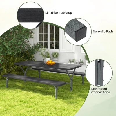 The picnic table with two 72” benches create spacious space for cozy meals with loved ones. Additionally, the HDPE tabletop is engineered to resist fading, weather damage, cracks, thus ensuring long-lasting durability. Reinforced by a robust powder-coated metal frame, our heavy duty camping table exudes excellent stability.Boasting elegant wood-like texture and sleek lines, the versatile picnic table bench set can effortlessly match with your outdoor space, such as gardens, patios, yards and decks.