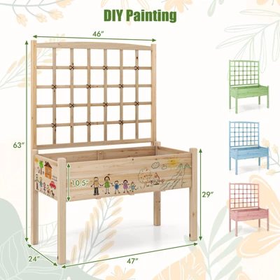 Elevate Your Gardening Game!Our wooden raised garden bed with a built-in trellis measures 47″ x 24″ x 63″ (L x W x H), providing ample space for various plants, such as climbing vines, flowers, herbs, vegetables, fruits, succulents, and more. The spacious planter box with a generous 4.7 Cu.ft soil capacity, provides a sturdy foundation for cultivating a variety of plants while supporting up to 176 lbs.The drainage holes on the bottom panels ensure proper water flow, promoting healthy root systems. Moreover, it boasts a lattice trellis for supporting climbing plants to grow upward or hanging decorations, adding versatility and charm to your outdoor space.