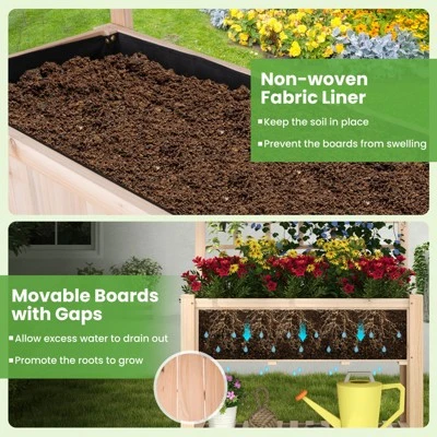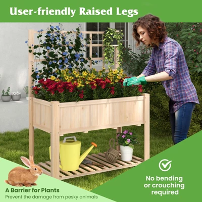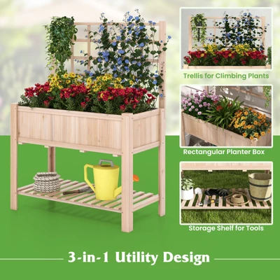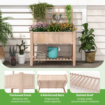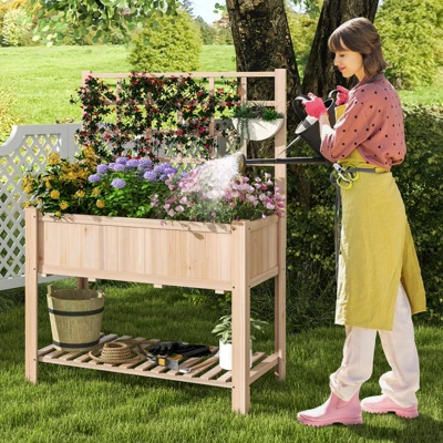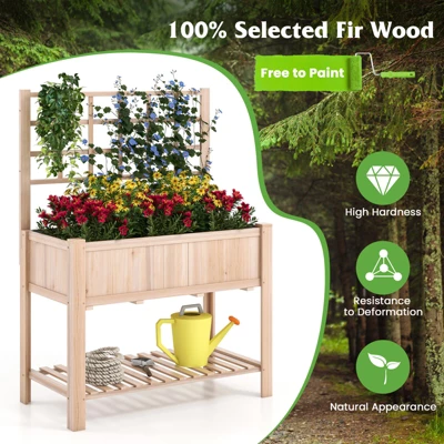 This raised garden bed with trellis will be a good helper for your daily gardening tasks. This elevated planter box is designed with the top and bottom storage shelves, and a deep planter box, providing ample planting and storage space. In addition, the trellis can be used for planting climbing plants or hanging small potted plants or gardening tools. Made of high quality fir wood, this freestanding planter box withstand many years of use indoors and outdoors, widely used in your patio, garden, balcony, greenhouse, etc.