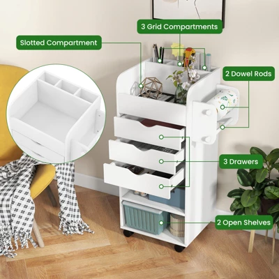 - 【Ample Storage Compartments】: With 3 shelves and 3 large drawers, this storage cart will provide large space for carton, packaging tape, scissors and brush pot. 3 slots at rear can store rolls of wrapping paper. What’s more, 2 dowels at side are convenient for holding spools of ribbon. Multiple divisions can make your room tidier.