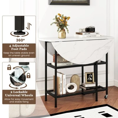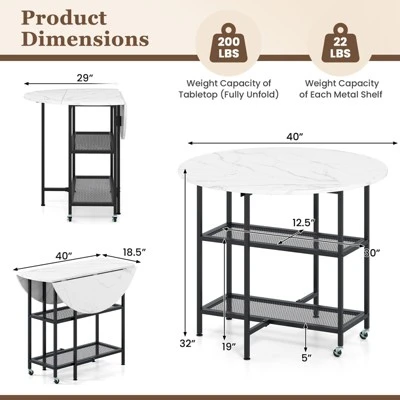 A Versatile and Space-Saving Dining Solution for Your Living Space!Our folding dining table measures 40″ x 32″ (Dia. x H) and features 2 drop leaf panels, allowing you to effortlessly transform it into a compact size ideal for small rooms or apartments. And it is designed with 2 open shelves to keep your essentials organized and within easy reach. Beyond dining, this table can also transform into a work station or sofa side table, catering to different lifestyles. Moreover, it is constructed from sturdy metal tubes, providing strong support, not easy to deform. And there are 4 adjustable footpads for enhanced stability.