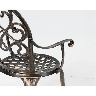 - Exquisite & Antique Table Set: This table set includes two chairs and one table and it comes with a delicate design with an antique bronze finish. This 3-piece brings an elegant touch to your patio, balcony, front or back yard. In addition, the chair is designed with a unique floral backrest and rhomboid seat, while the table is constituted of square graphics.