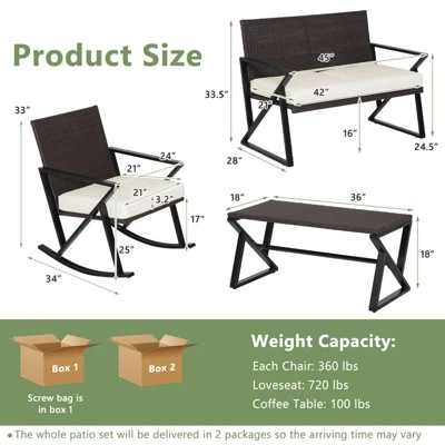 Experience ultimate comfort and relaxation with this exquisite 4-piece patio rocking chair table set. Designed to enhance your leisure time, this set features ergonomic seats with soft cushions that provide endless comfort. The single chair is equipped with a solid rocking base, ensuring high stability and safety as you gently rock back and forth. Adding to its functionality, the compact coffee table allows for easy access to your favorite drinks or snacks. Its stability is further enhanced by the additional PP board beneath the tabletop. The adjustable footpads on the table and loveseat ensure stability even on uneven ground.