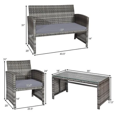 - Comfortable Patio Sofa Set: This conversation set with 1 loveseat, 2 single sofas and 1 coffee table can perfectly satisfy the seating needs of a group of people. Our 4 Piece wicker set features comfortable cushions (pillows in the pic are not included) that are made of durable polyester fabric and soft sponge. You and your family will enjoy the leisure time when seat on the sofa.