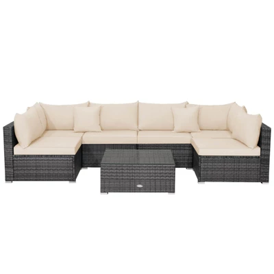 Experience the ultimate comfort of outdoor relaxation with this 7-piece patio furniture set, perfect for unwinding in tranquility while taking in the surroundings. Set your essential items on the tempered glass coffee table, then settle onto the soft padded cushions, allowing yourself to escape the rush of daily life. The spacious and wide seats provide ample room, with included throw pillows for cozy head support. The clips ensure the seat stays securely in place, whether sitting or lying down. Designed for all outdoor conditions, this weather-resistant PE rattan and anti-rust steel frame set can withstand morning dew or midday sun, adapting seamlessly to various environments.