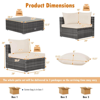 Material: PE Rattan, Steel, Tempered Glass, Polyester, Cotton, Sponge