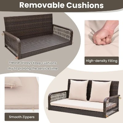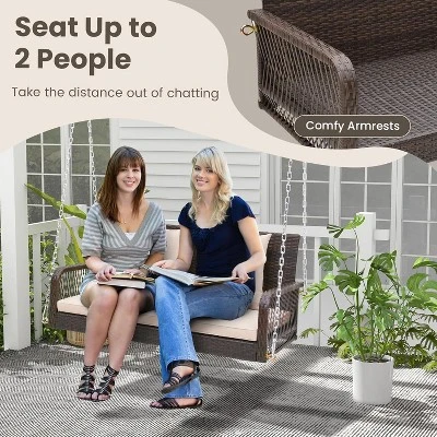 Enhance the charm and relaxation of your outdoor space with this wicker outdoor porch swing!The swing bench comes with hanging chains that allow for easy installation and adjustment. And then, the comfy back and seat cushions are ready to bring you relaxing experience. So you can invite your beloved one to enjoy this cozy and relaxed moment. No matter how long you have swinging, the 800 lbs weight capacity will always ensure stability and safety. Crafted with a wicker construction, this hanging porch swing exudes a timeless elegance that can elevate the aesthetics of your deck, garden or yard. Whether you want to relax after a tiring day or have a heartwarming conversation with a loved one, the 2-seater hanging patio bench offers the perfect spot to unwind.