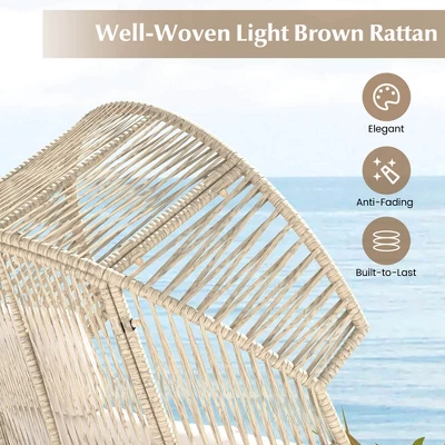 Enhance your relaxation experience with this sophisticated oversized egg chair, suitable for both indoor and outdoor use. With its ergonomic design and generous seating area, this chair guarantees endless comfort. Crafted with a high-quality light brown rattan weave for durability and style, it also comes with dual 12″ thick cushions and a padded headrest for ultimate relaxation. The cushion covers are breathable and skin-friendly. Supported by a sturdy X-shaped metal frame, this egg chair can hold up to 400 lbs, making it a stable and elegant choice for any home or garden. Add a touch of luxury and comfort to your living space with this stylish and cozy egg chair.